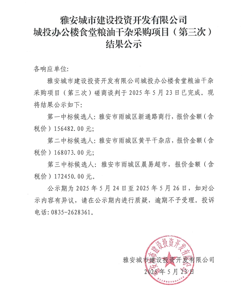 雅安城市建設(shè)投資開(kāi)發(fā)有限公司城投辦公樓食堂糧油干雜采購(gòu)項(xiàng)目(第三次)結(jié)果公示