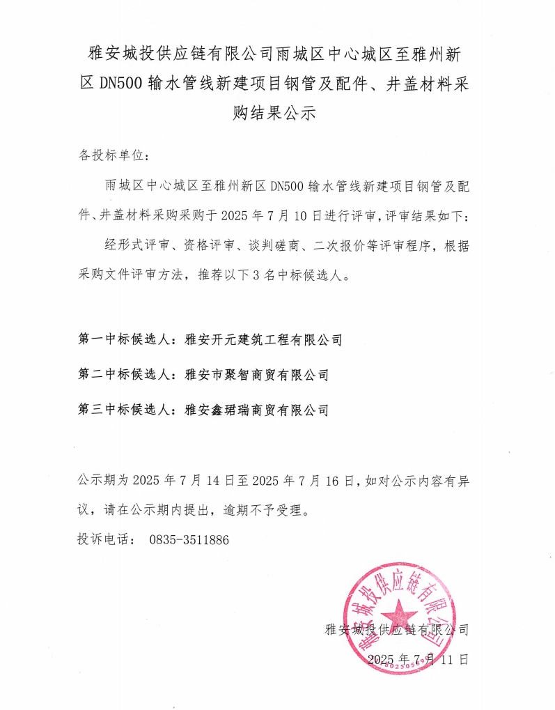 雅安城投供應(yīng)鏈有限公司雨城區(qū)中心城區(qū)至雅州新區(qū)DN500輸水管線新建項目鋼管及配件、井蓋材料采購結(jié)果公示