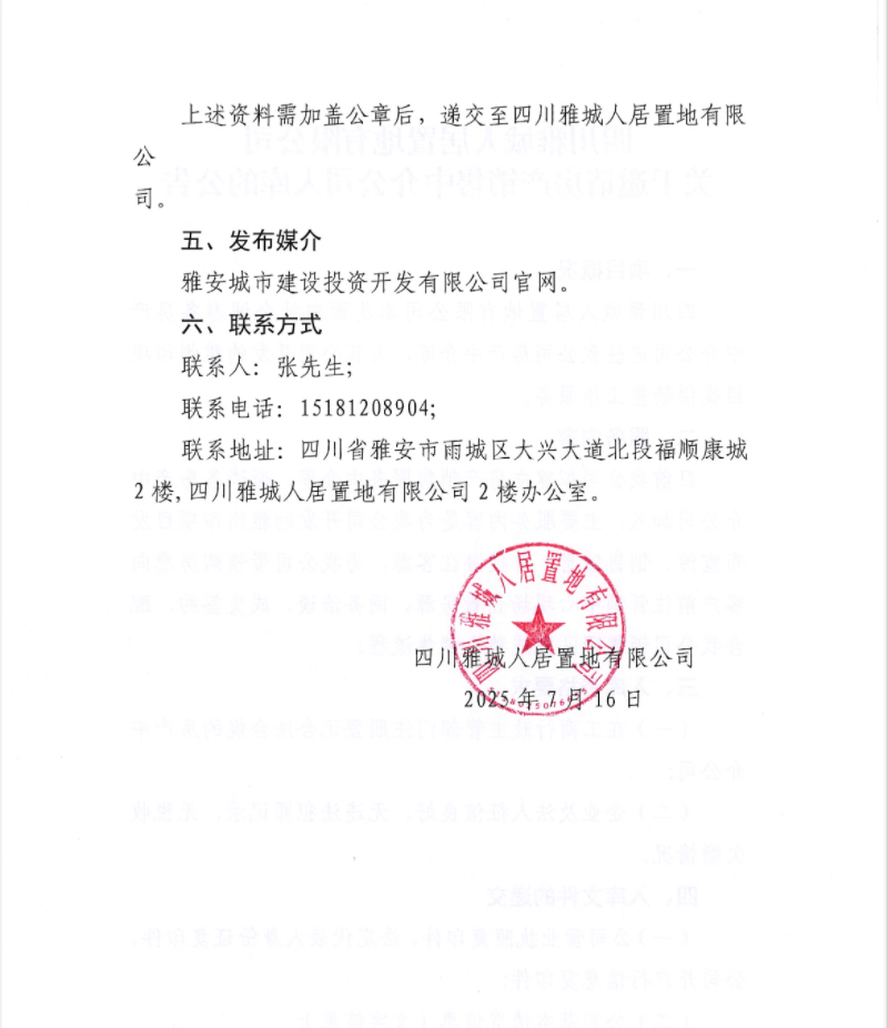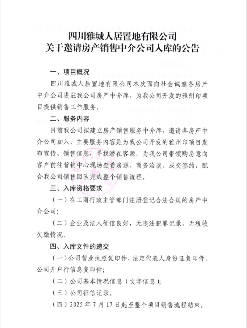 四川雅城人居置地有限公司關于邀請房產(chǎn)銷售中介公司入庫的公告