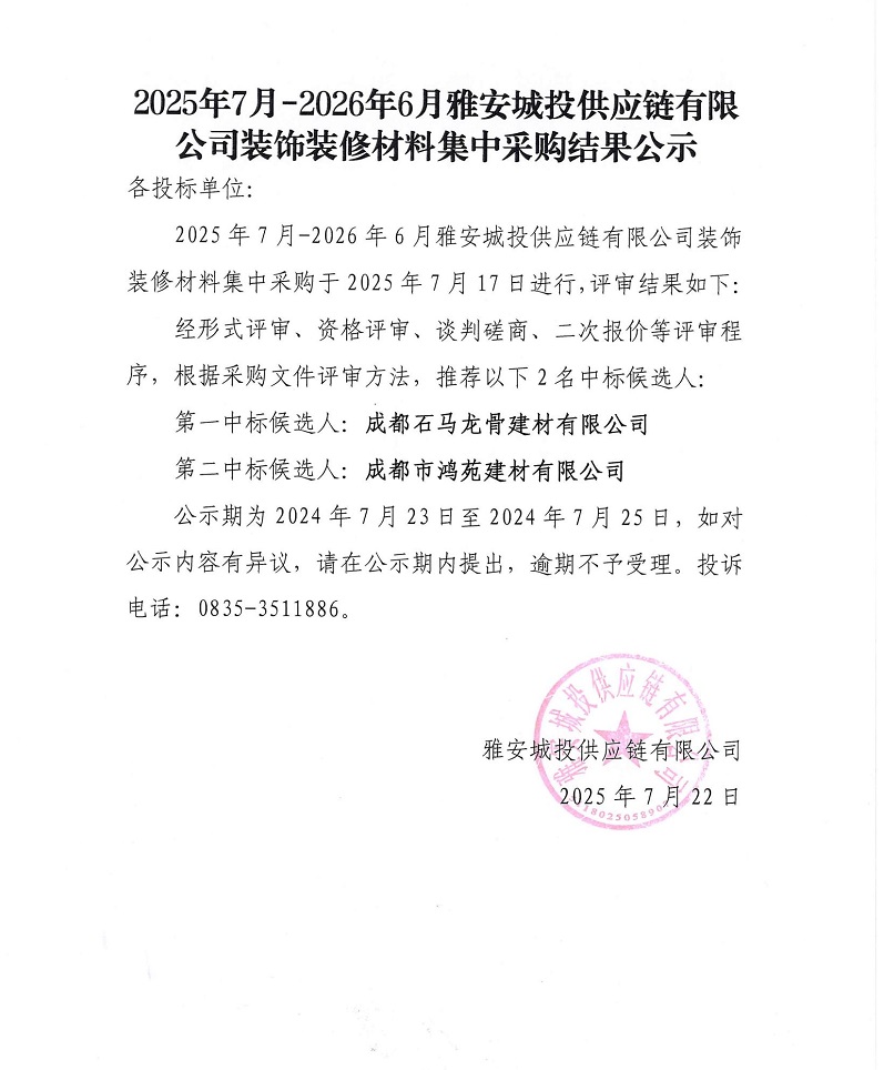 2505年7月-2026年6月雅安城投供應(yīng)鏈有限公司裝飾裝修材料集中采購(gòu)結(jié)果公示