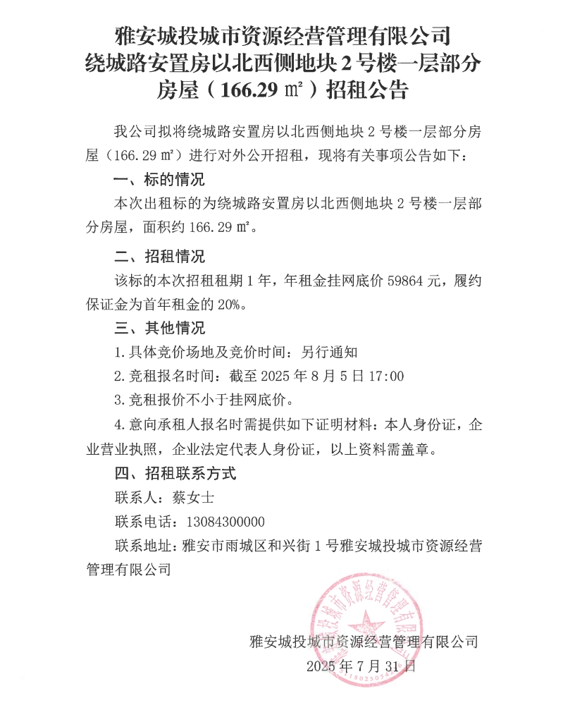 雅安城投城市資源經(jīng)營(yíng)管理有限公司繞城路安置房以北西側(cè)地塊2號(hào)樓一層部分房屋(166.29m²)招租公告