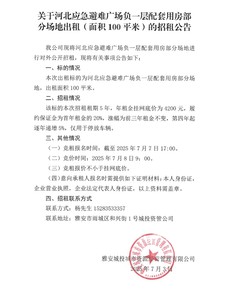關(guān)于河北應(yīng)急避難廣場(chǎng)負(fù)一層配套用房部分場(chǎng)地出租(面積100平米)的招租公告