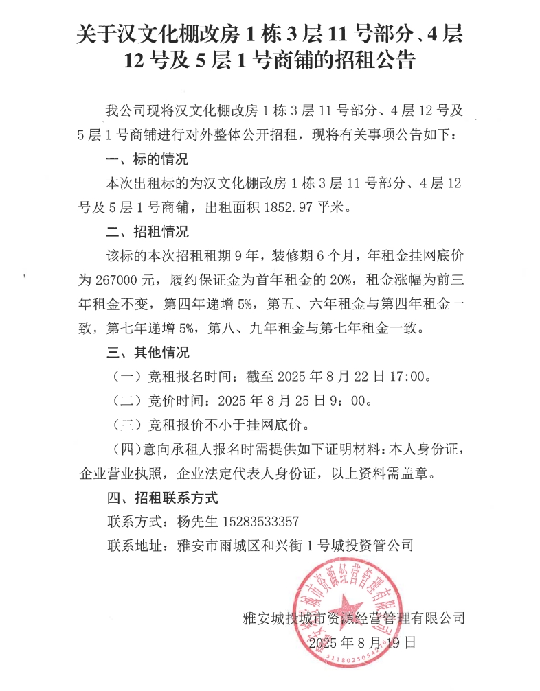 關于漢文化棚改房1棟3層11號部分、4層12號及5層1號商鋪的招租公告
