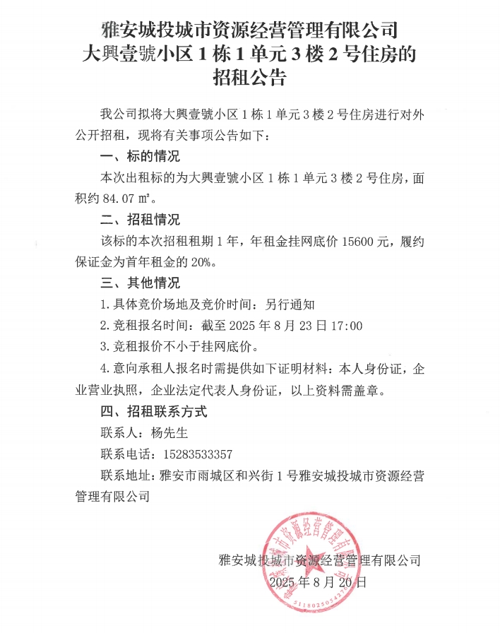 雅安城投城市資源經營管理有限公司大興壹號小區(qū)1棟1單元3樓2號住房的招租公告