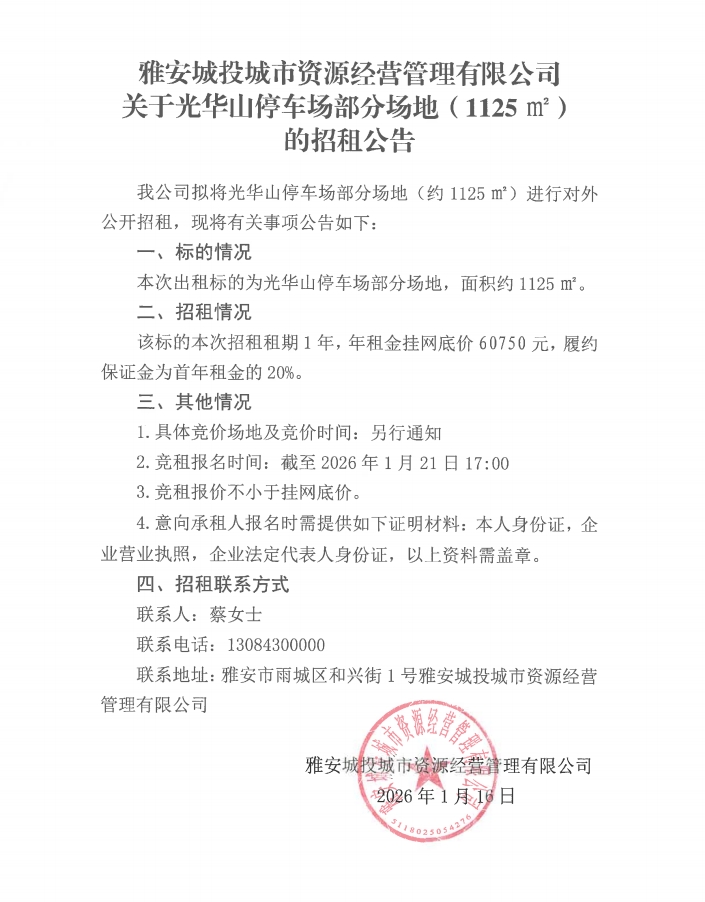 雅安城投城市資源經(jīng)營管理有限公司關(guān)于光華山停車場部分場地(1125㎡)的招租公告