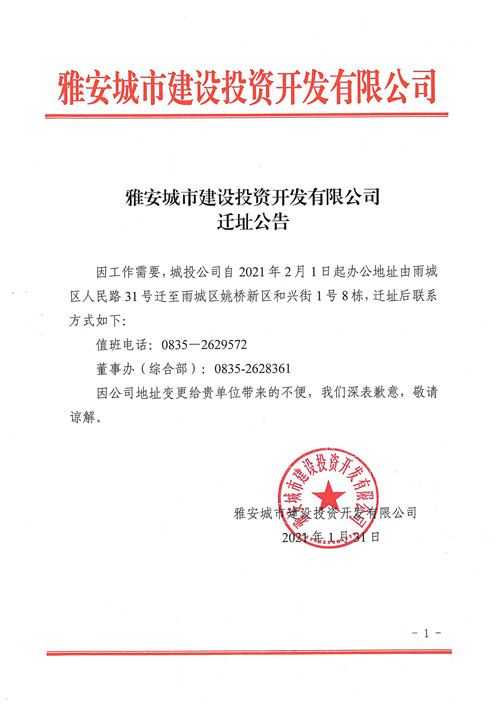 雅安城市建設投資開發(fā)有限公司遷址公告