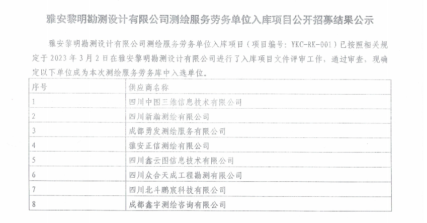 雅安黎明勘測(cè)設(shè)計(jì)有限公司測(cè)繪服務(wù)勞務(wù)單位入庫(kù)項(xiàng)目公開招募結(jié)果公示