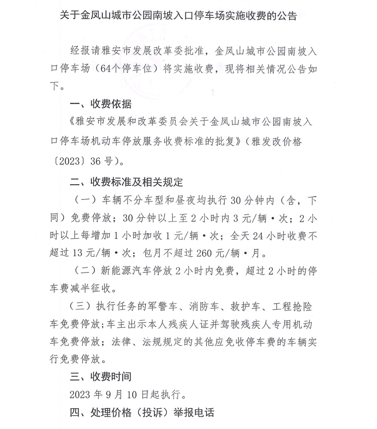 關(guān)于金鳳山城市公園南坡入口停車場實(shí)施收費(fèi)的公告