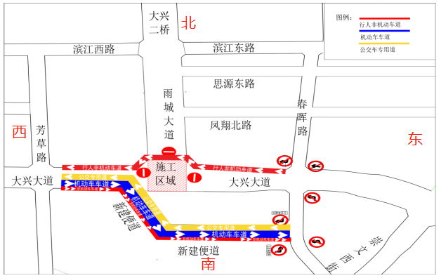 新建便道僅供社會(huì)車輛由西向東通行(公交車除外),南側(cè)行人非機(jī)動(dòng)車由便道通行;由東向西車輛繞行,行人非機(jī)動(dòng)車由北側(cè)預(yù)留通道通行。